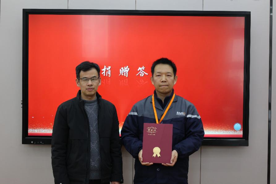 泥城镇经发办主任黄烨玮代表泥城镇人民政府向捐赠方颁发捐赠证书